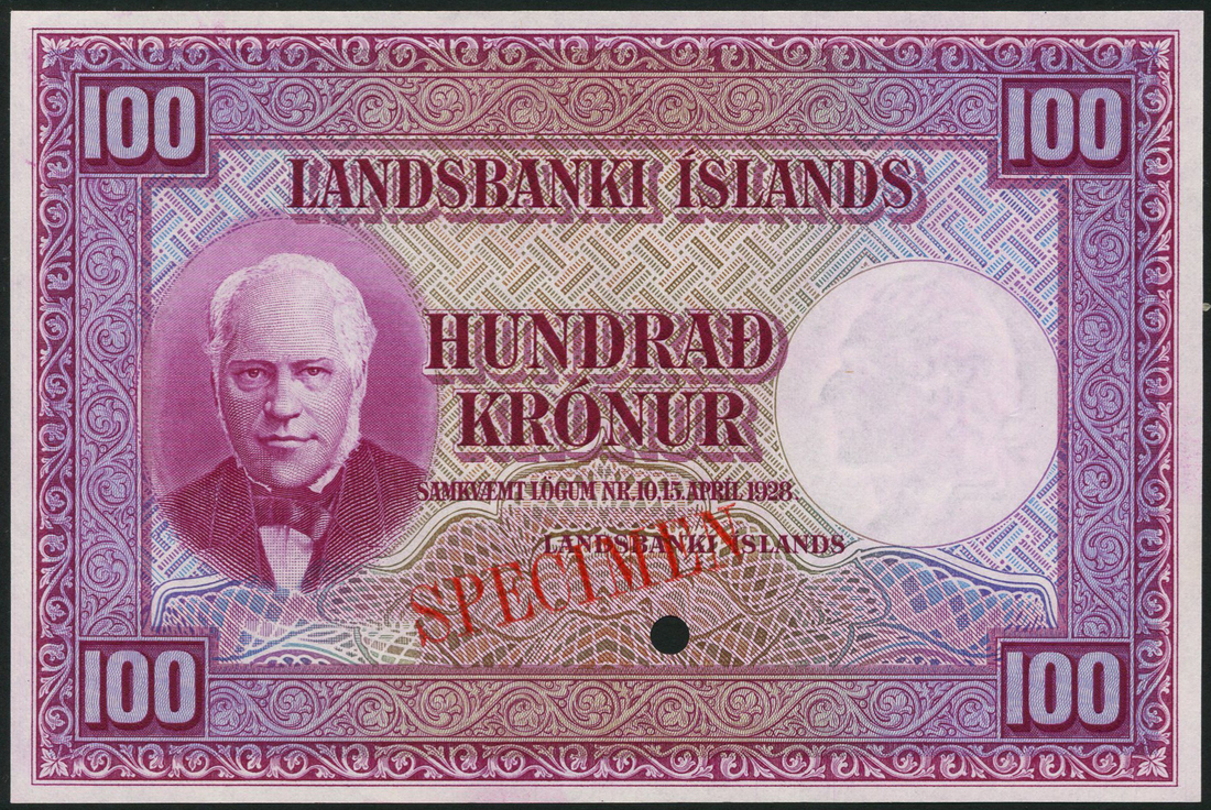 (†) Landsbanki Islands, colour trial 100 kronur, L.1928, purple on multicolour underprint, J. Sigurdsson at left, value at each corner, reverse purple, flock of sheep at right, one cancellation hole, red SPECIMEN overprint