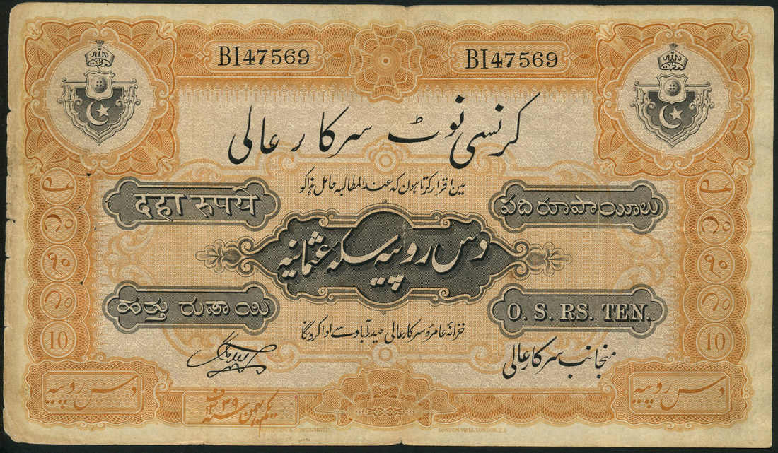 Hyderabad, Government issue, 10 rupees, 1916, serial number BI47569, burnt orange and black on lilac underprint, coat of arms top left and right, Fakruddin Ahmad signature variety
