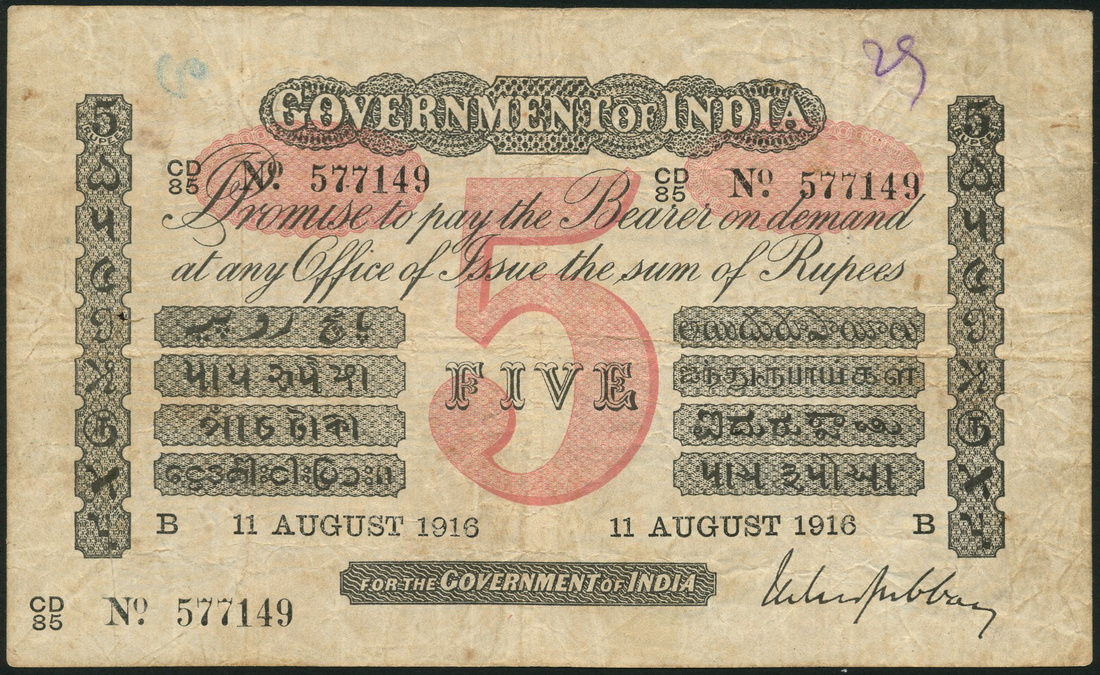 (x) Government of India, 5 rupees, 11 August 1916, serial number CD/85 577149, black and white, value in pink underprint at centre, Gubbay signature