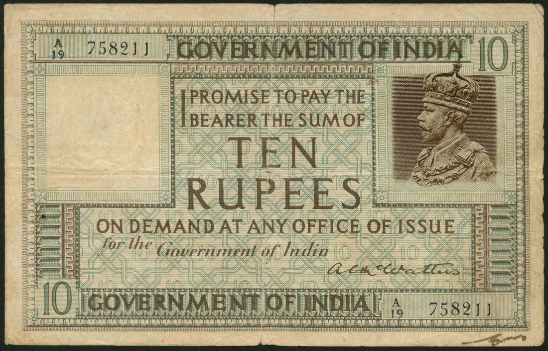 (x) Government of India, 10 rupees, ND (May 1923), serial number A/19 758211, A.C. McWatters signature variety, blue and brown, head of King George V in brown panel at right