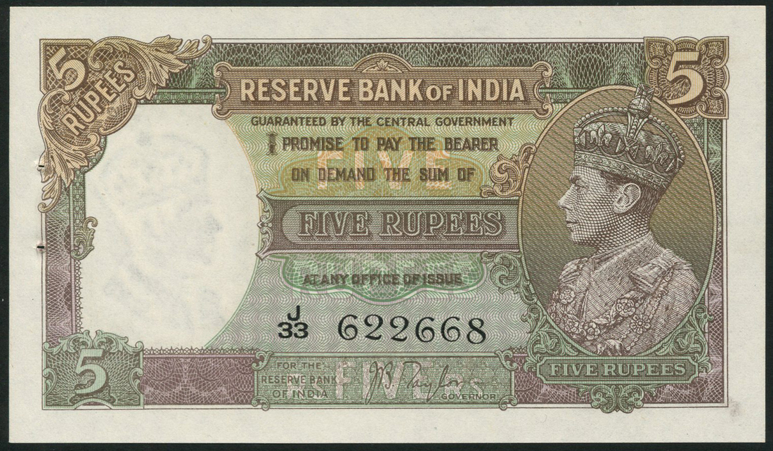 (x) Reserve Bank of India, 2 rupees, ND (1943), serial number 429287, pink and multicolour, also 5 rupees, ND (1937), serial number J33 722668, brown and multicolour, both portrait King George VI at right, reverse, tiger at centre and at right respectively, together with 1 rupee, ND (1940), blue and green King George VI on coin at right