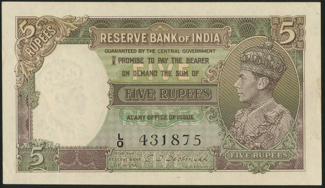 (x) Reserve Bank of India, a consecutive run of 5 rupees, ND (1938), serial numbers L/O 431871-6, C.D. Deshmukh signature variety, brown on green underprint, portrait of King George VI at right