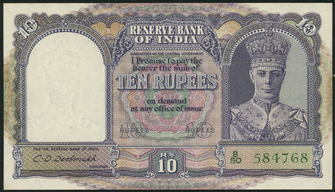 (x) Reserve Bank of India, 5 Rupees, ND, (1943), serial number L/6 956889, signature Deshmukh, brown and green, King George VI at right, reverse value in guilloche at left, bank seal at right; 10 Rupees, ND (1943), serial number B/50 584768, purple and multicoloured, King George VI at right, reverse dhow
