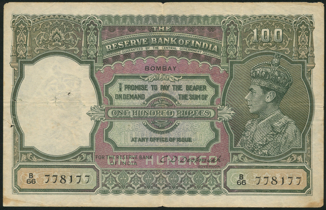 (x) Reserve Bank of India, 100 rupees, ND (1938), serial number B/66 778177, C.D. Deshmukh signature variety, green on lilac, King George VI at right