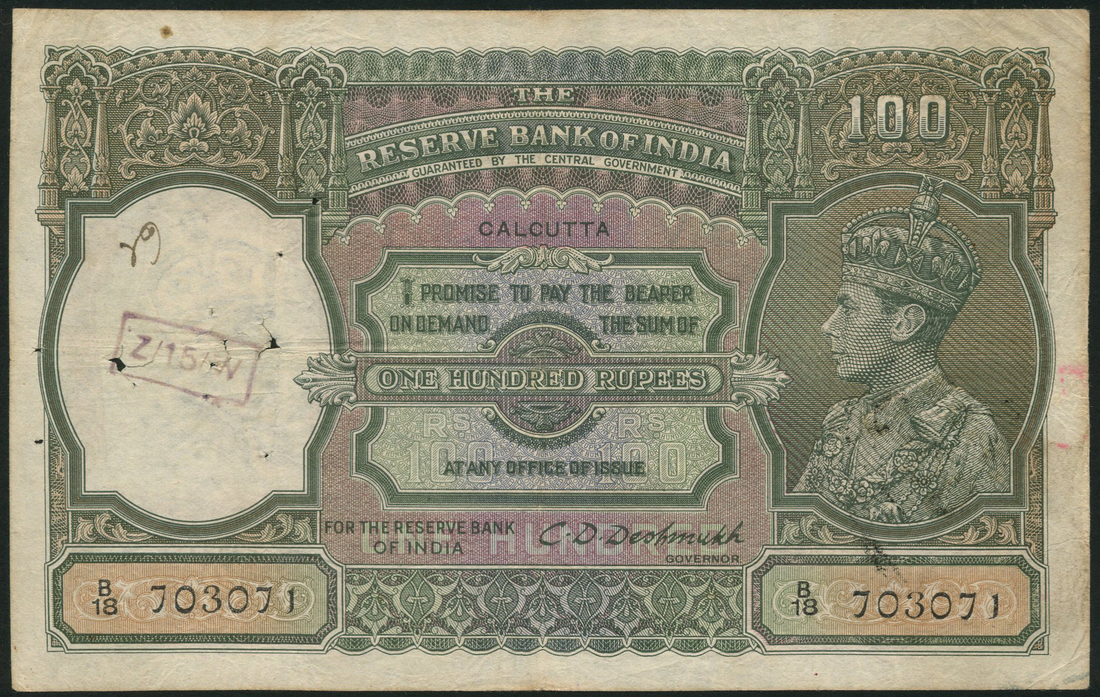 (x) Reserve Bank of India, 100 rupees, ND (1943), serial number B18 703071, olive green and lilac, portrait King George VI at right, reverse, tiger at centre and top right