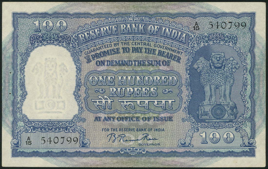 (x) Reserve Bank of India, 100 rupees, ND (1951), black serial number A/15 540799, Rama Rau signature variety, blue on multicolour, Ashoka column at right