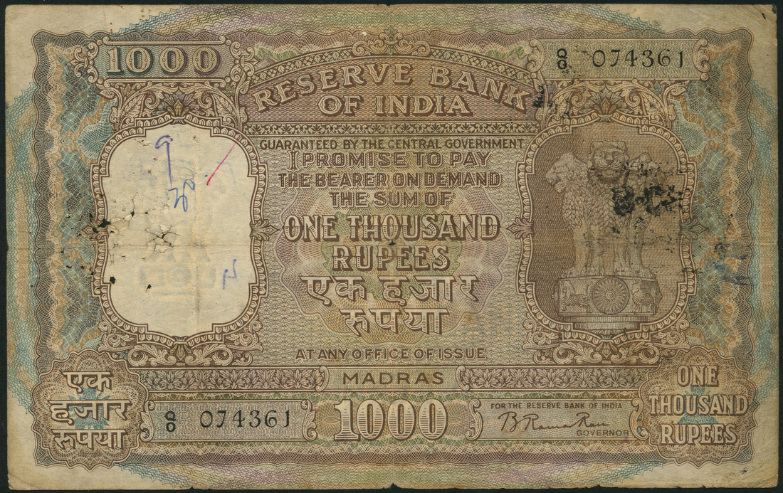 (x) Reserve Bank of India, 1000 rupees, Madras, ND, serial number Q/0 074361, B Rama Rau signature, brown on multicolour underprint, text in English and Hindi, Asoka column at right