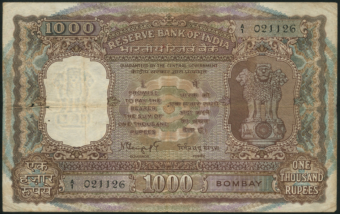 (x) Reserve Bank of India, 1000 rupees, Bombay, ND (1975), serial number A/1 021126, N.C. Sengupta signature variety, brown on multicolour underprint, text in English and Hindi, Asoka column at right