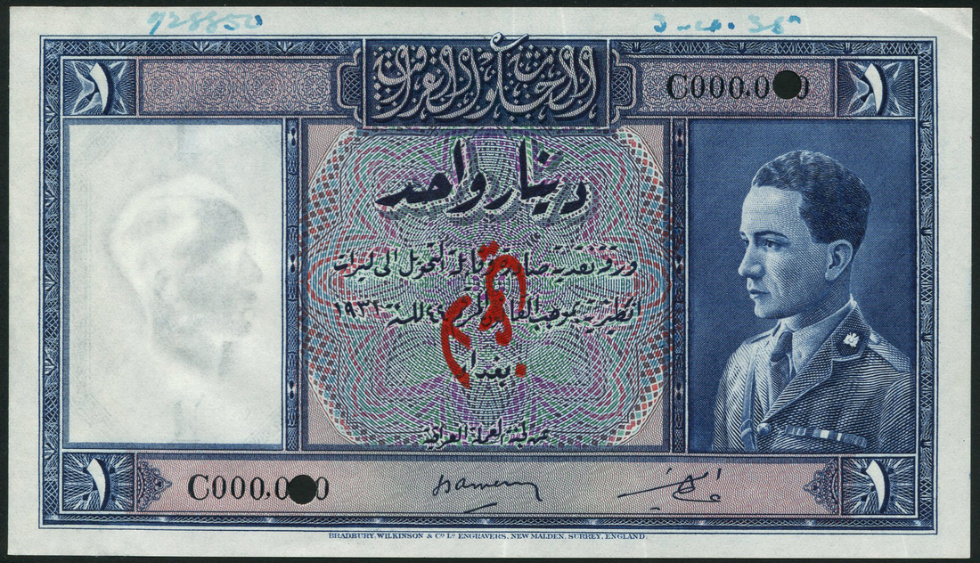 (†) Government of Iraq, specimen 1 dinar, law of 1931 (1934-), serial number C 000000, blue and multicoloured, King Ghazi at right, signatures of Amery and Ata Amin