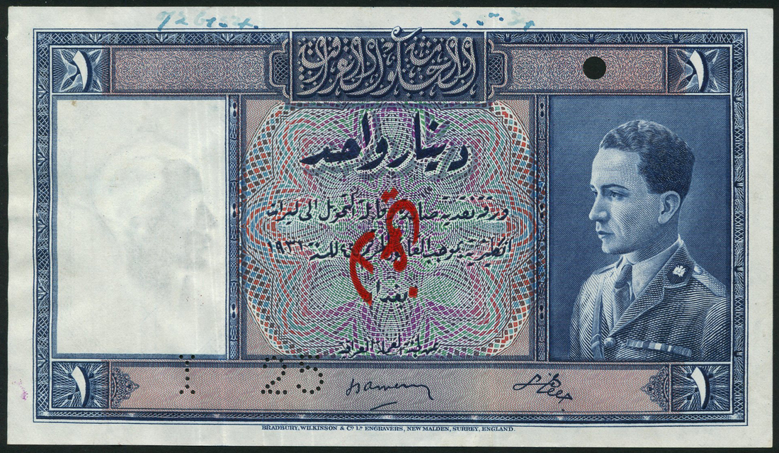 (†) Government of Iraq, specimen 1 dinar, law of 1931 (1934), no serial numbers, blue and multicoloured, King Ghazi at right, signatures of Amery and al Askari