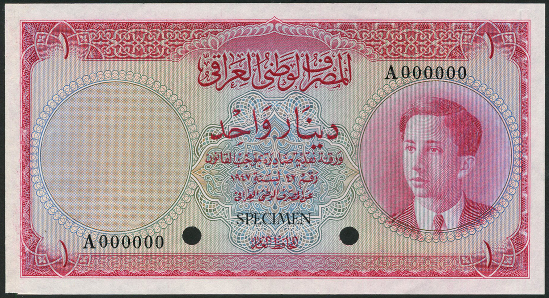 (†) National Bank of Iraq, colour trial 1 dinar, 1947, serial number A 000000, lilac and multicoloured, King Faisal II as a youth at right, reverse lilac, an equestrian statue of King Faisal I at centre