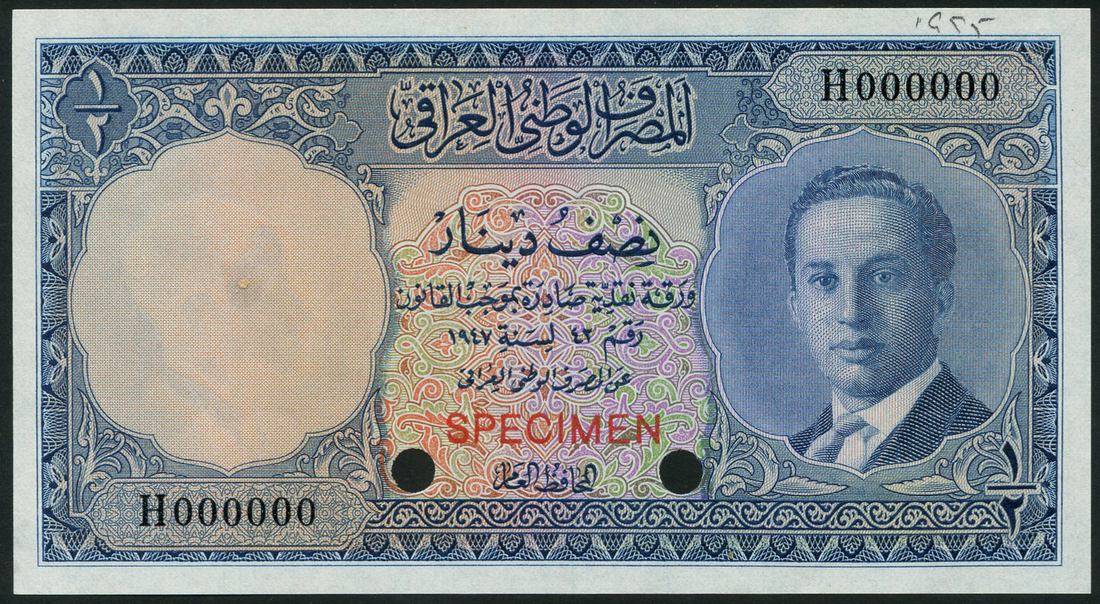 (†) National Bank of Iraq, colour trial 1/2 dinar, 1947, serial number H 000000, blue and multicoloured, King Faisal II as a young man at right, reverse blue, the Malwiya Tower at the Great Mosque of Samarra