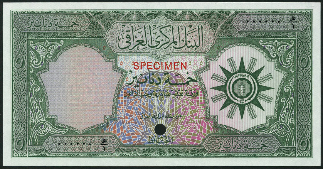 (†) Central Bank of Iraq, colour trial 1/4 dinar, brown, colour trial 1/2 dinar, blue and colour trial 5 dinars, green, all ND (1958/1959), all arms of the Republic at right, all zero serial numbers