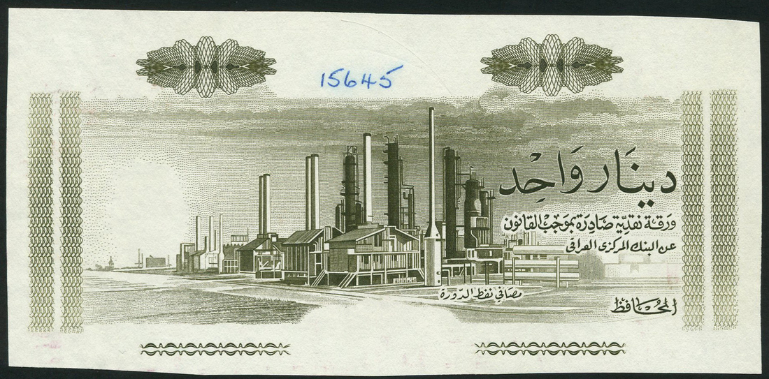 (†) Central Bank of Iraq, obverse uniface stage die proofs 1 Dinar (2), ND (1971), the first blue, bank legend, borders and value in all four corners, the second brownish black, oil refinery, also reverse uniface stage proof 1 Dinar, blue, value at left, ornate doorway at centre, bank legend at top, and obverse uniface stage die proof 5 Dinars, ND (1971), blue-green and brown, bank legend and borders only