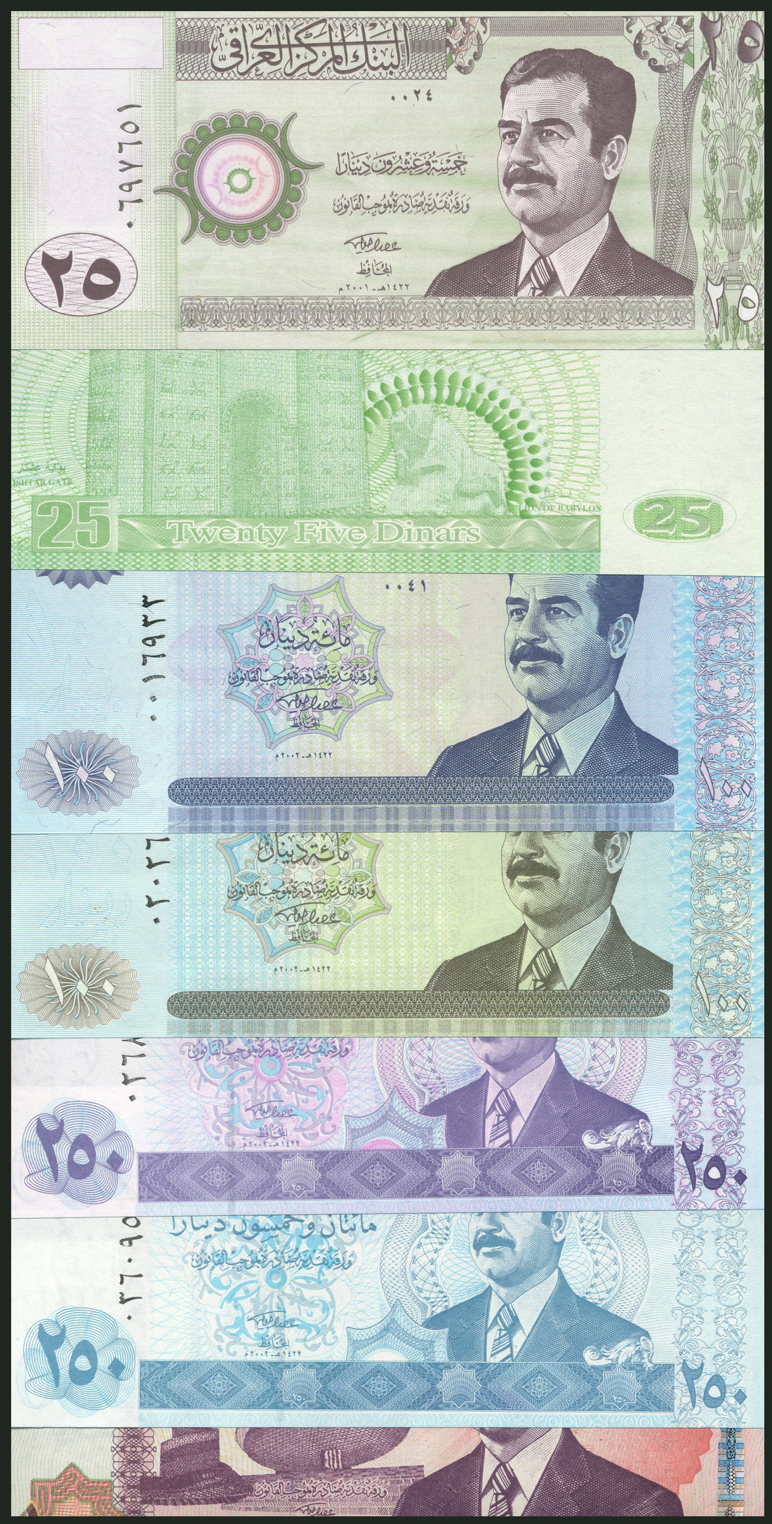 (x) Central Bank of Iraq, a full set from the 2004 issue comprising 25, 100, 250 and 10,000 dinars and a full set of colour trials from the 2004 issue comprising 25, 100, 250 and 10,000 dinars