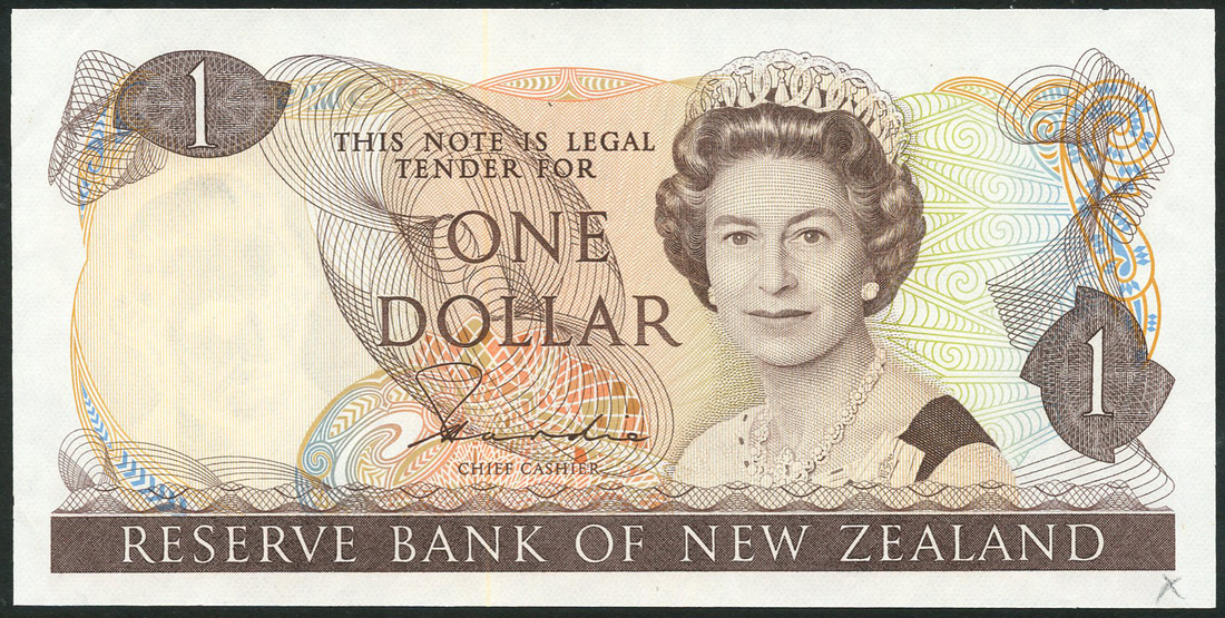 Reserve Bank of New Zealand, $1, ND (1981), no serial numbers, signature H. R. Hardie, brown on multicoloured underprint, mature portrait of Queen Elizabeth II at right, reverse clematis at left, fantail at centre