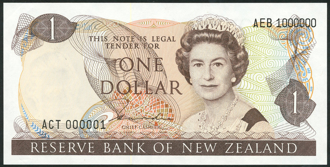 Reserve Bank of New Zealand, printer's archival specimen $1, ND (1981), serial number run ACT 000001 to AEB 1000000, signature H. R. Hardie, brown on multicoloured underprint, mature portrait of Queen Elizabeth II at right, reverse clematis at left, fantail at centre