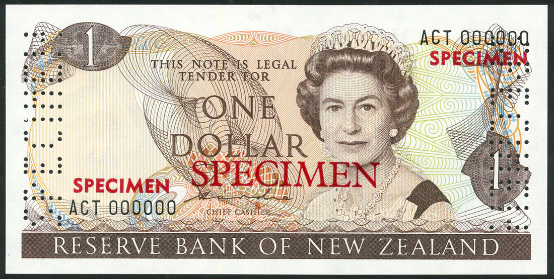 Reserve Bank of New Zealand, specimen $1, ND (1981), serial number ACT 000000, signature H. R. Hardie, brown on multicoloured underprint, mature portrait of Queen Elizabeth II at right, reverse clematis at left, fantail at centre, overprinted SPECIMEN in red three times on obverse and once on reverse, perforated SPECIMEN at left and right