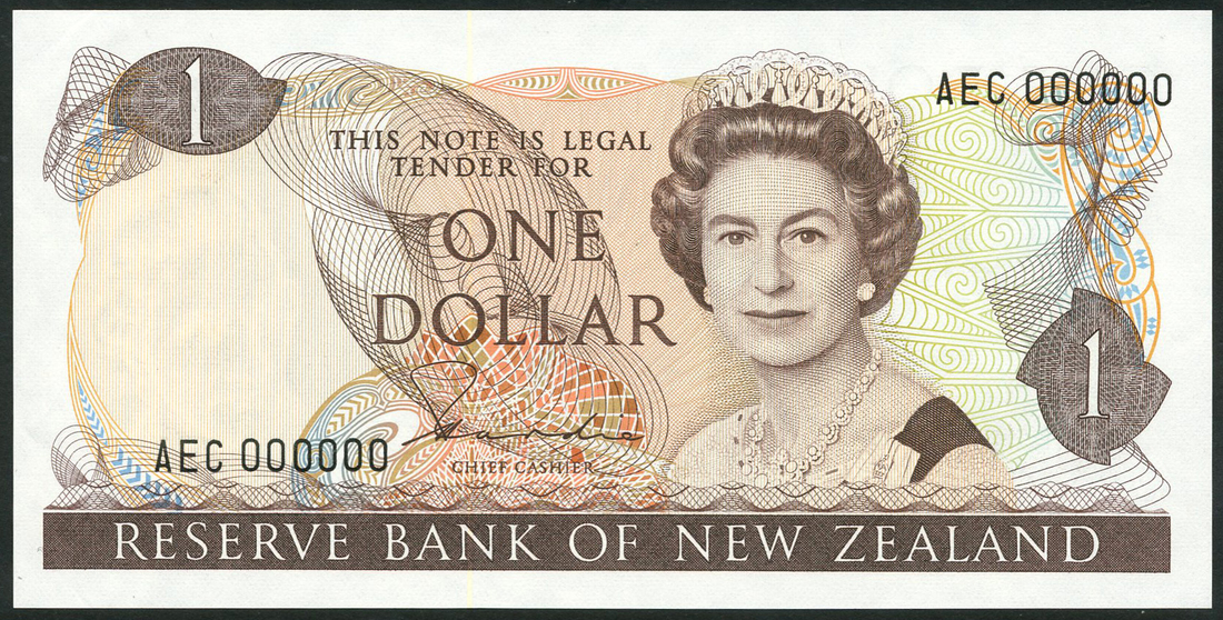 Reserve Bank of New Zealand, specimen $1, ND (1981), serial number AEC 000000, signature H. R. Hardie, brown on multicoloured underprint, mature portrait of Queen Elizabeth II at right, reverse clematis at left, fantail at centre
