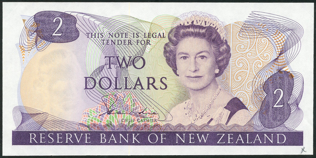 Reserve Bank of New Zealand, $2, ND (1981), no serial numbers, signature H. R. Hardie, purple on multicoloured underprint, mature portrait of Queen Elizabeth II at right, reverse mistletoe at left, rifleman at right