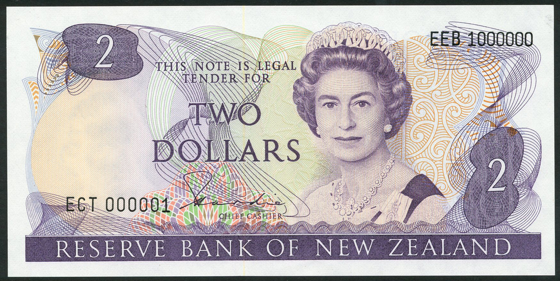 Reserve Bank of New Zealand, printer's archival specimen $2, ND (1981), serial number run ECT 000001 to EEB 1000000, signature H. R. Hardie, purple on multicoloured underprint, mature portrait of Queen Elizabeth II at right, reverse mistletoe at left, rifleman at centre