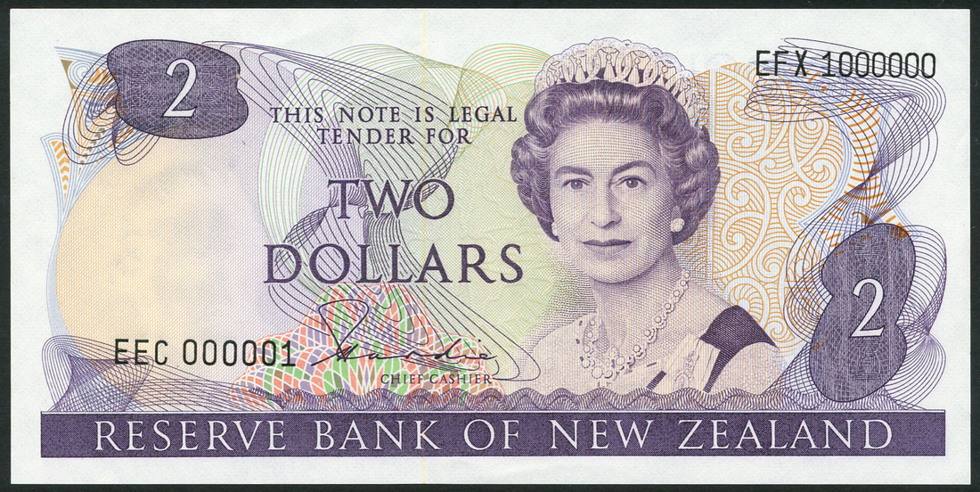 Reserve Bank of New Zealand, printer's archival specimen $2, ND (1981), serial number run EEC 000001 to EFX 1000000, signature H. R. Hardie, purple on multicoloured underprint, mature portrait of Queen Elizabeth II at right, reverse mistletoe at left, rifleman at centre