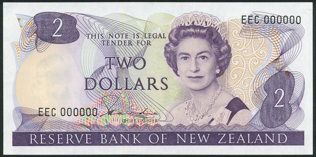 Reserve Bank of New Zealand, specimen $2, ND (1981), serial number EEC 000000, signature H. R. Hardie, purple on multicoloured underprint, mature portrait of Queen Elizabeth II at right, reverse mistletoe at left, rifleman at centre