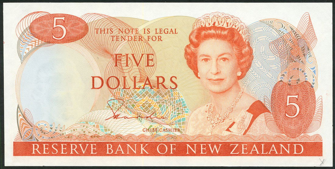 Reserve Bank of New Zealand, $5, ND (1981), no serial numbers, signature H. R. Hardie, orange on multicoloured underprint, mature portrait of Queen Elizabeth II at right, reverse kowhai at left, tui at centre