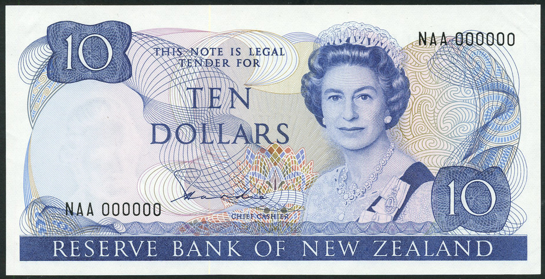 Reserve Bank of New Zealand, specimen $10, ND (1981), serial number NAA 000000, signature H. R. Hardie, blue on multicoloured underprint, mature portrait of Queen Elizabeth II at right, reverse mountain lily at left, kea at centre