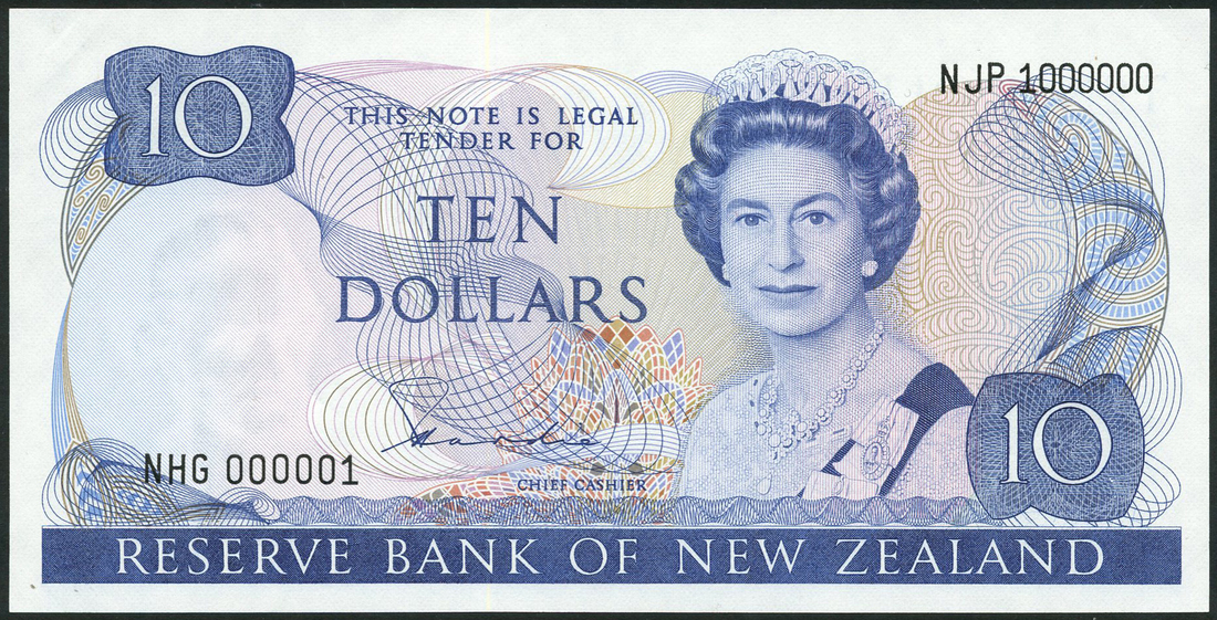 Reserve Bank of New Zealand, printer's archival specimen $10, ND (1981), serial number run NHG 000001 to NJP 1000000, signature H. R. Hardie, blue on multicoloured underprint, mature portrait of Queen Elizabeth II at right, reverse mountain lily at left, kea at centre