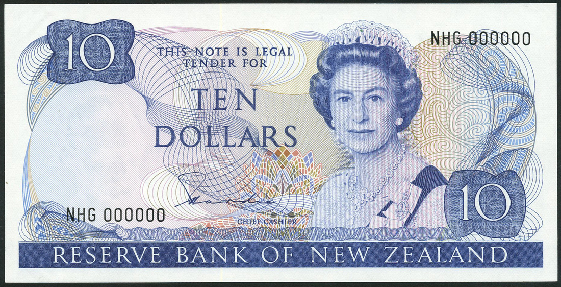 Reserve Bank of New Zealand, specimen $10, ND (1981), serial number NHG 000000, signature H. R. Hardie, blue on multicoloured underprint, mature portrait of Queen Elizabeth II at right, reverse mountain lily at left, kea at centre