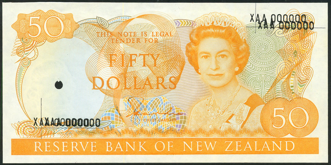 (†) Reserve Bank of New Zealand, error specimen $50, ND (1983), serial number XAA 000000 (duplicated in error at upper right and lower left), signature Hardy, yellow-orange on multicoloured underprint, mature portrait of Queen Elizabeth II at right, reverse Morepork Owl at centre right, pohutukawa at left, one punch hole
