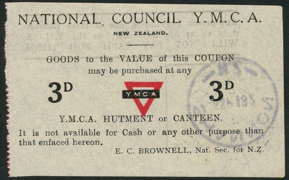 (x) New Zealand, National Council Y.M.C.A., Union Bank of Australia, 3D (2) coupon, handstamped 6 September 1918, black and white and issued at Shannon Camp during World War I, also a convalescent Depot Canteen chit for 1 cent, 1943 and for use in Kalavere, New Caledonia, handsigned,