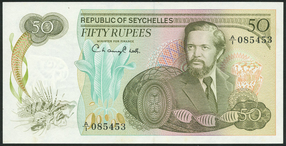 Republic of Seychelles, 50 rupees, ND (1976), serial number A/1 085453, olive green and tan on multicolour underprint, James Marcham at right, fish and sea shells with values, reverse fisherman on the shore