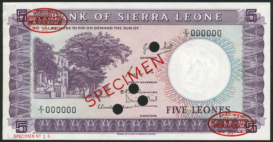 (†) Bank of Sierra Leone, specimen 1 leone, ND (1969), prefix A/7, green, signature 3, specimen 2 leones, ND (1964), prefix B/18, red, signature 1 and specimen 5 leones, ND (1964), prefix C/1, violet, signature 1, all cotton tree and the Law Courts in Freetown at left