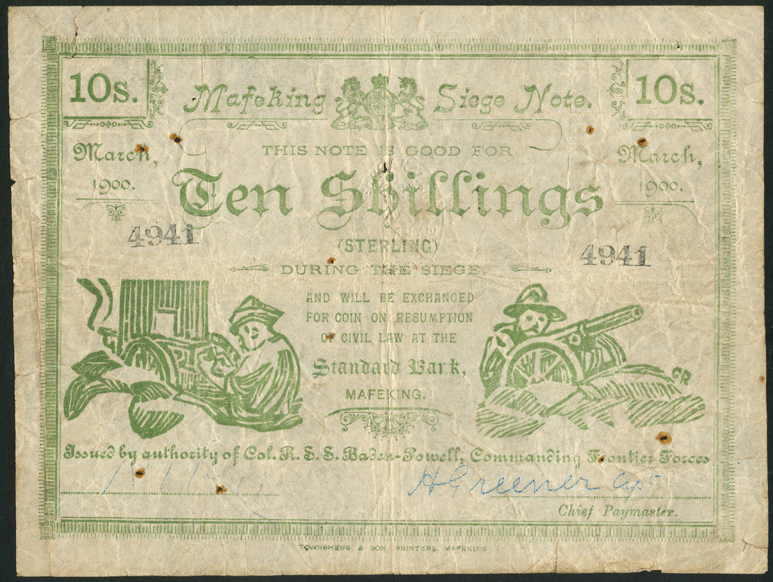 Mafeking Siege Note, 10 shillings, March 1900, serial number 4941, green on cream paper, Royal arms top centre, men with cannons at low left and right, Greener signature