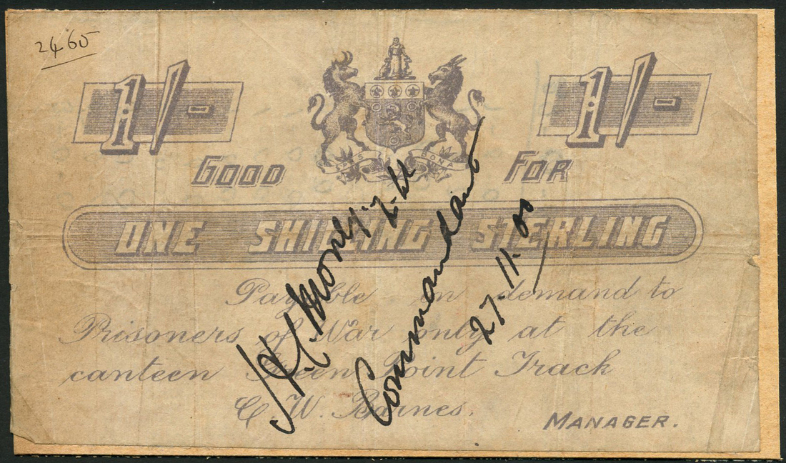 Green Point Track, South Africa/Boer War, 1 shilling (second issue), ND, mauve on white. arms top centre, value top left and right, manuscript annotation across face of note 'J.H.Money, Commandant, 27.11.00'