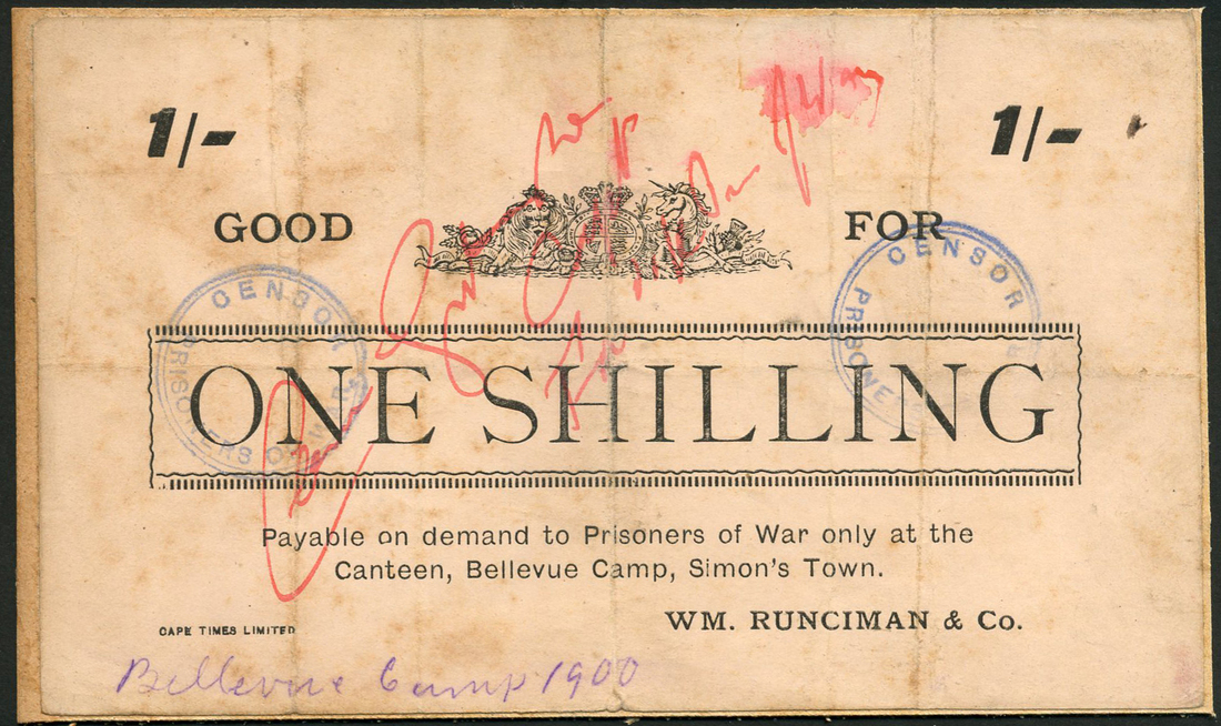 Bellevue Camp, Simon's Town, South Africa/Boer War, 1 shilling (type 2), ND (1900), black text on cream paper, arms top centre, two circular handstamps in field and red manuscript annotation 'Capt.for Prisoners of War'. This notes for use at the canteen run by W.W.Runciman & Co