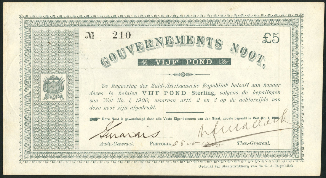 Zuid-Afrikaansche Republiek, £5, 28 May 1900, serial number 210, grey-green on card like paper, arms in ornate panel at left, value at centre and top right, embossed seal at left, reverse, text