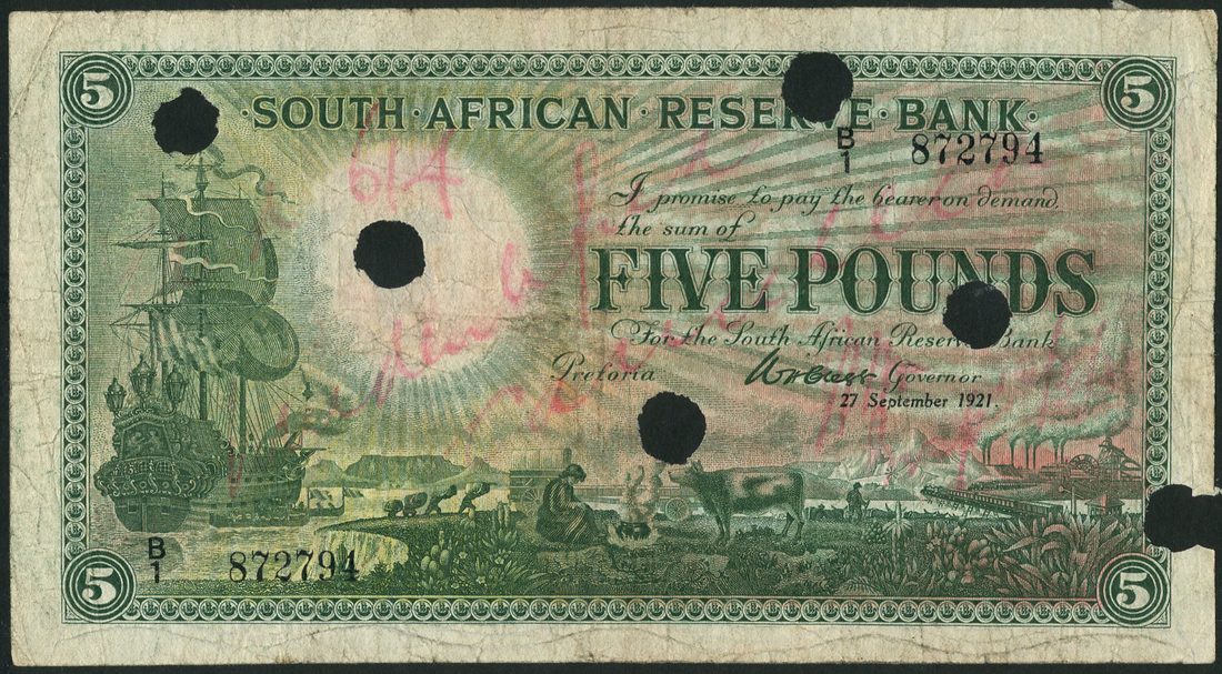 South African Reserve Bank, 5 pounds, 27 September 1921, serial number B/1 872794, green on multicolour underprint, Galleon at left, farming, cities and factories along lower edge, reverse same image in reverse in Afrikaans, six mid sized punch-holes and cancelled annotations