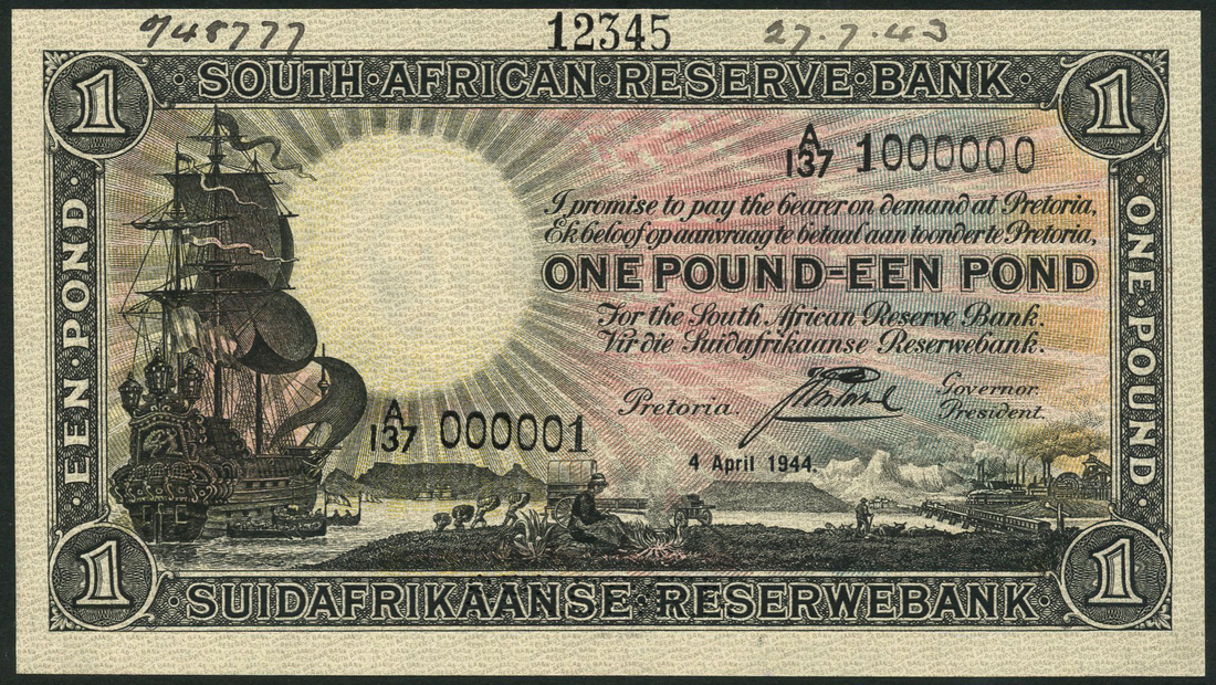 (†) South African Reserve Bank, printer's archival specimen £1 (2), 4 April 1944 and 6 April 1944, serial number runs A/137 000001 to A/137 1000000 and A/138 000001 to A/138 1000000 respectively, both Postmus signature, black on pale pink, orange and blue underprint, galleon at left, allegorical scenes at lower centre and lower right, reverse coat of arms at centre, both perforated SPECIMEN