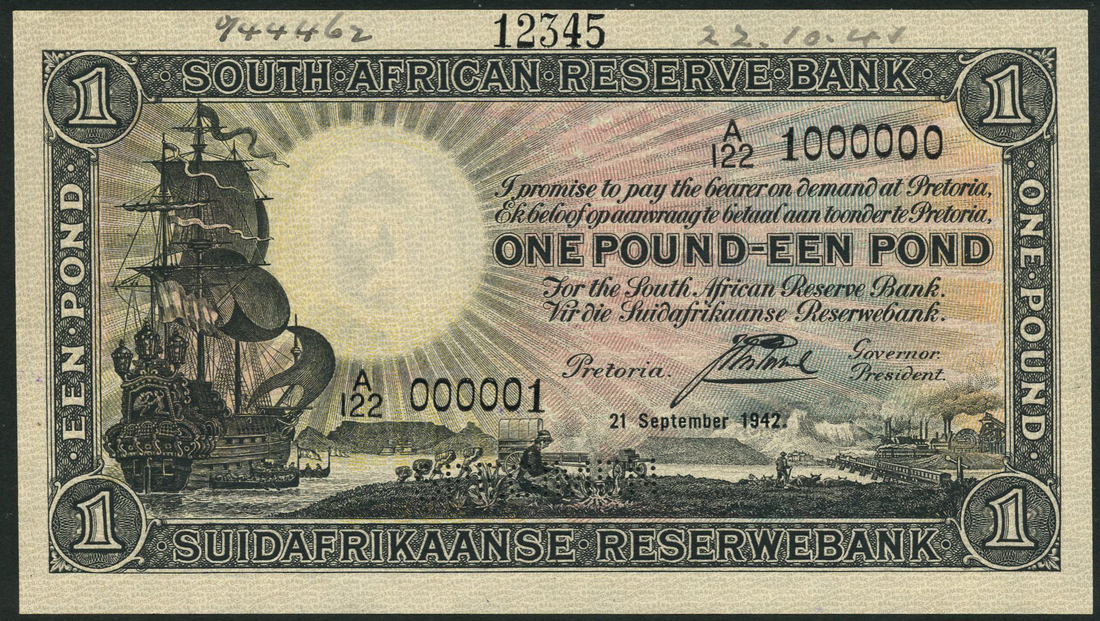 (†) South African Reserve Bank, printer's archival specimen £1 (2), 10 September 1942 and 21 September 1942, serial number runs A/121 000001 to A/121 1000000 and A/122 000001 to A/122 1000000 respectively, both Postmus signature, black on pale pink, orange and blue underprint, galleon at left, allegorical scenes at lower centre and lower right, reverse coat of arms at centre, both perforated SPECIMEN