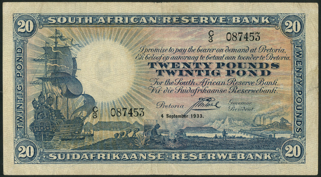 South African Reserve Bank, 20 pounds, 4 September 1933, serial number C/3 087453, blue on multicolour underprint, Galleon at left, farming, cities and factories along lower edge, reverse same image in reverse in Afrikaans, six mid sized punch-holes and cancelled annotations