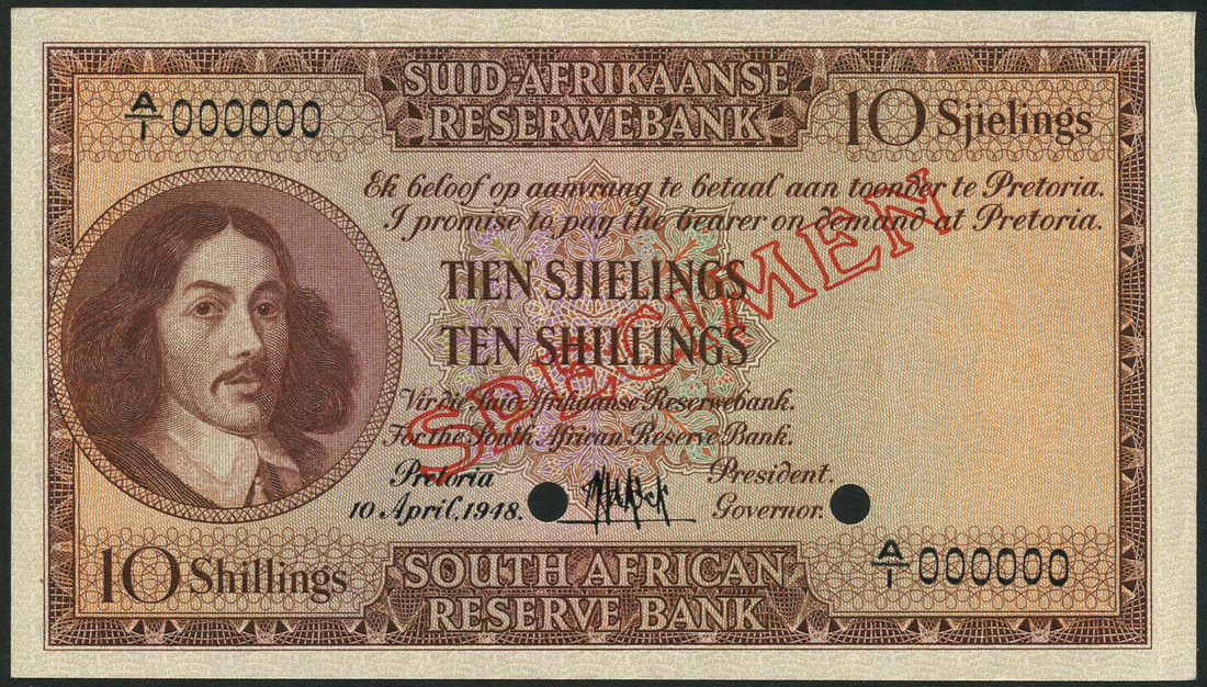 (†) South African Reserve Bank, specimen 10 Shillings, 10 April 1948, serial number A/1 000000, first line of text in Afrikaans; also printer's archival specimen 10 Shillings, 8 November 1948, serial number run A/14 000001 to A/14 1000000, first line of text in English, both de Kock signature, red-brown and multicoloured, Van Riebeeck at left, reverse arms at centre, the first overprinted SPECIMEN diagonally in red on obverse and reverse, two punch holes, the second perforated SPECIMEN