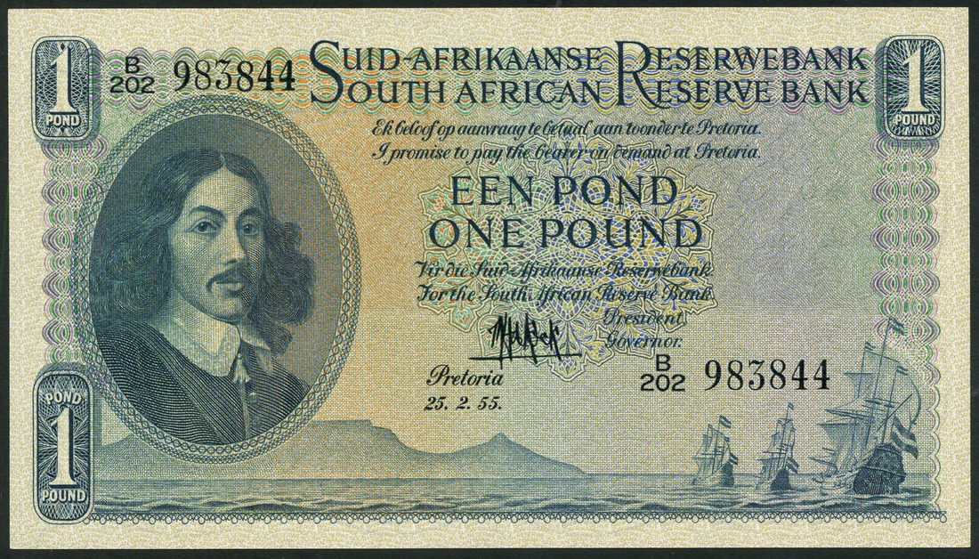 South African Reserve Bank, £1 (2), 25 February 1955, consecutive serial numbers B202 983843/4, blue on multicolour, portrait Jan van Riebeeck at left, sailing ships low right, first line of bank name and value in Afrikaans, reverse, lion at centre