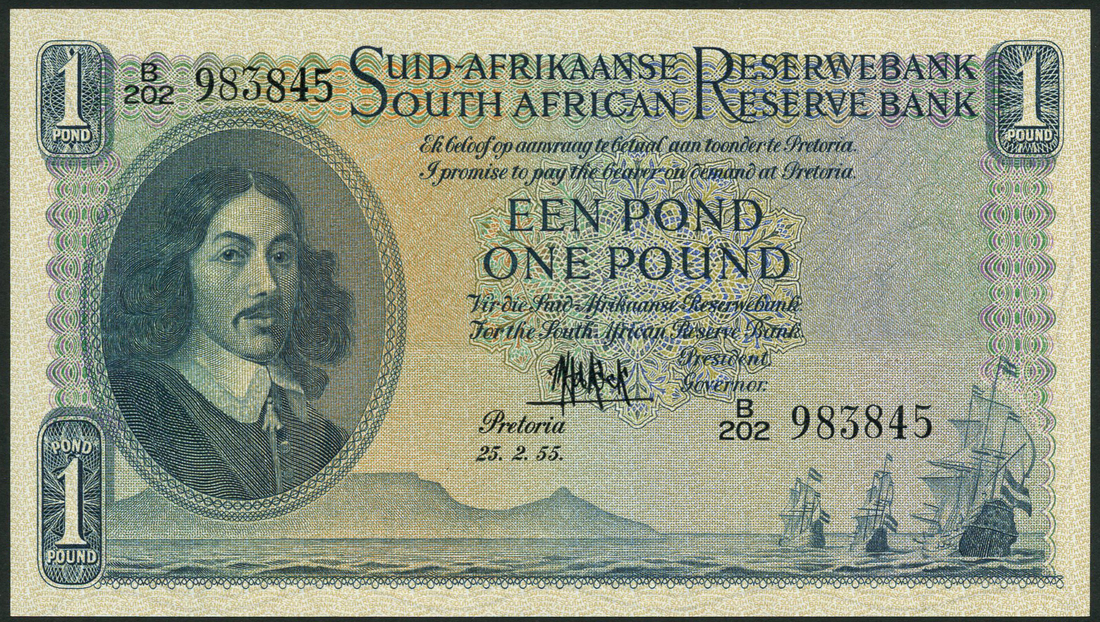 South African Reserve Bank, £1 (2), 25 February 1955, consecutive serial numbers B202 983845/6, blue on multicolour, portrait Jan van Riebeeck at left, sailing ships low right, first line of bank name and value in Afrikaans, reverse, lion at centre
