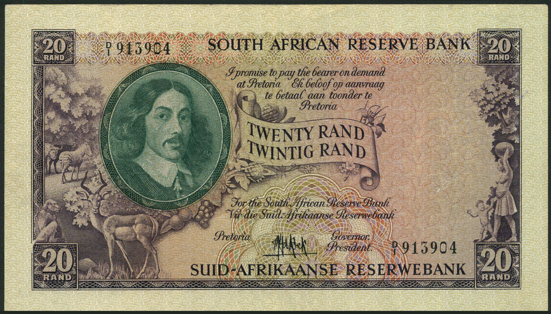 South African Reserve Bank, a small group comprising, 1 pound, 1958, 2 rand (2), 1962, 10 rand (2), 1961 and 1962 and 20 rand, 1961, all with Van Riebeeck at left