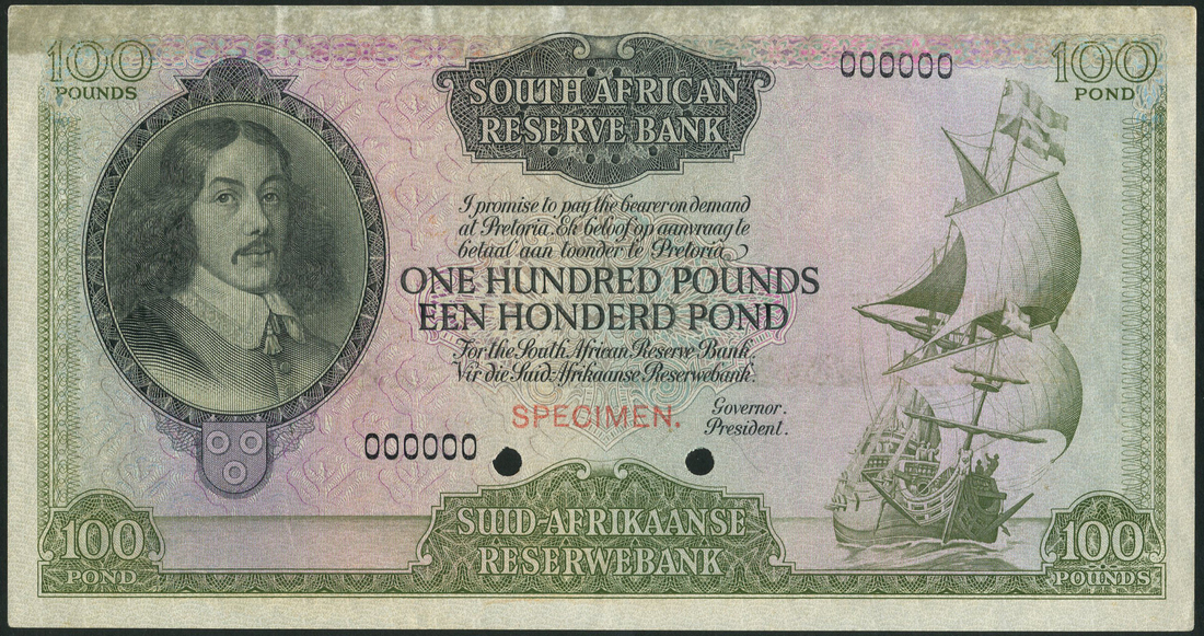 (†) South African Reserve Bank, specimen colour trial £100, ND (ca 1952), serial number 000000, no signature, sage green and black on pink, pale blue and pale green underprint, portrait of Van Riebeeck at upper left, galleon at right, first line of text in English, reverse coat of arms, value in guilloches with acanthus scrolls at lower left and right, overprinted SPECIMEN in red on obverse and reverse, two punch holes
