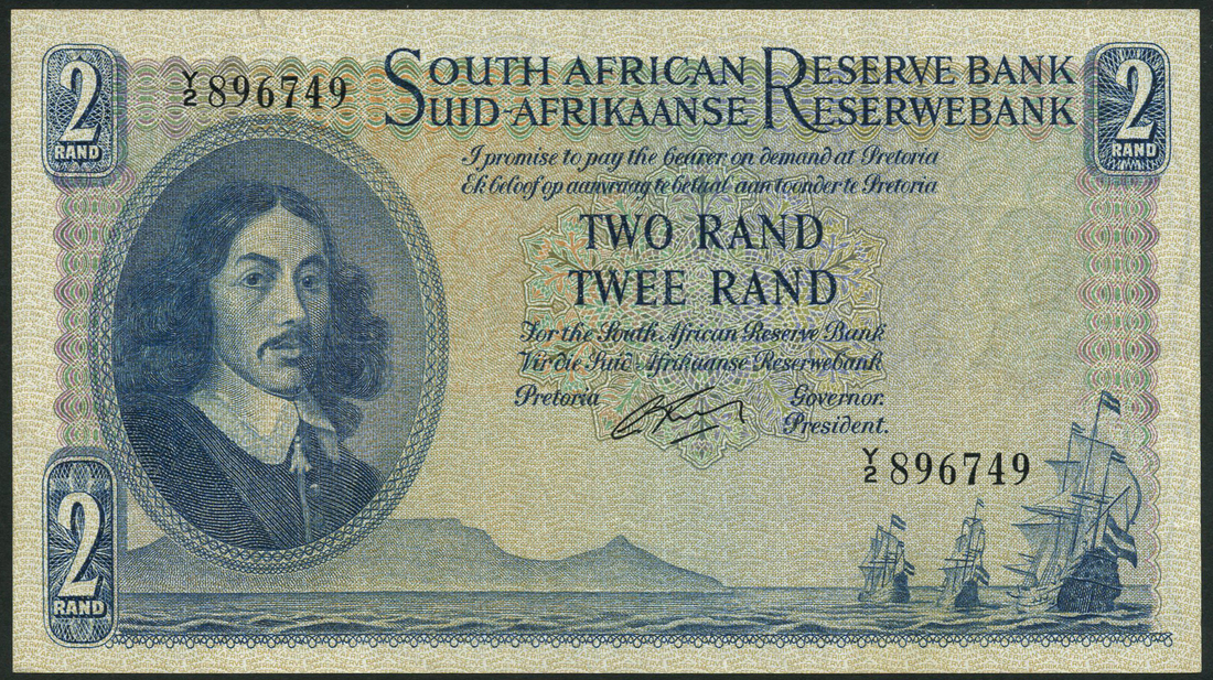 South African Reserve Bank, 2 rand, ND (1962-65), serial number Y2 896749, blue on multicolour underprint, portrait Jan van Riebeeck at left, sailing ships low right, reverse, lion at centre