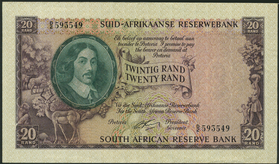 South African Reserve Bank, 10 rand (2), ND (1961-65), prefixes C/2 and C/34, and 20 rand, ND (1961), prefix D/2, first with de Kock signature, others with Rissik signature, all with van Riebeeck at left
